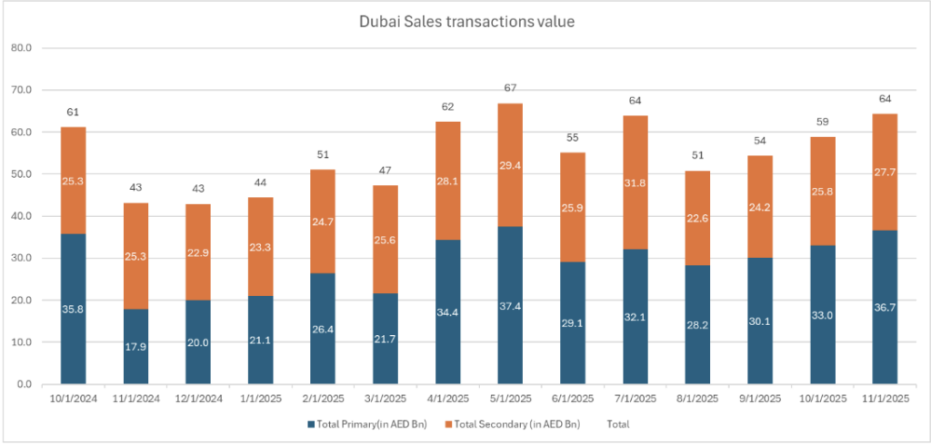 شهد السوق العقاري في دبي زخمًا قويًا خلال شهر نوفمبر، حيث ارتفعت تدفقات رؤوس الأموال ومستويات النشاط بشكل ملحوظ مقارنة بالفترة نفسها من العام الماضي. فبعد فترة من التباطؤ النسبي في أكتوبر، بلغ إجمالي مبيعات السوقين الأولي والثانوي خلال شهر نوفمبر نحو 64.4 مليار درهم، بزيادة قدرها 49% على أساس سنوي في القيمة الإجمالية للصفقات. ويعود هذا النمو بالدرجة الأولى إلى التسارع الكبير في أداء السوق الأولي (بنسبة 105% على أساس سنوي)، مدعومًا بارتفاع مستمر في السوق الثانوي (بنسبة 9% على أساس سنوي).