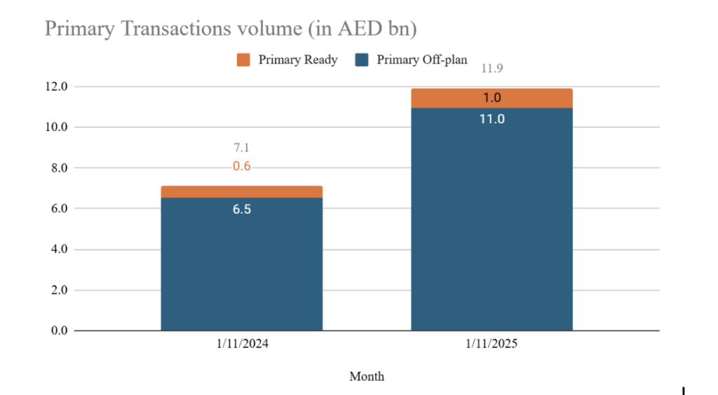 أظهر السوق الأولي أداءً استثنائيًا في نوفمبر، حيث ارتفعت مبيعاته بنسبة 105% على أساس سنوي، بفضل النمو القوي في مبيعات الوحدات قيد الإنشاء والجاهزة. وسجّلت مبيعات الوحدات قيد الإنشاء ارتفاعًا بنسبة 72% على أساس سنوي، مما يعكس الثقة المتزايدة من المستثمرين والمستخدمين النهائيين في المشاريع الجديدة.