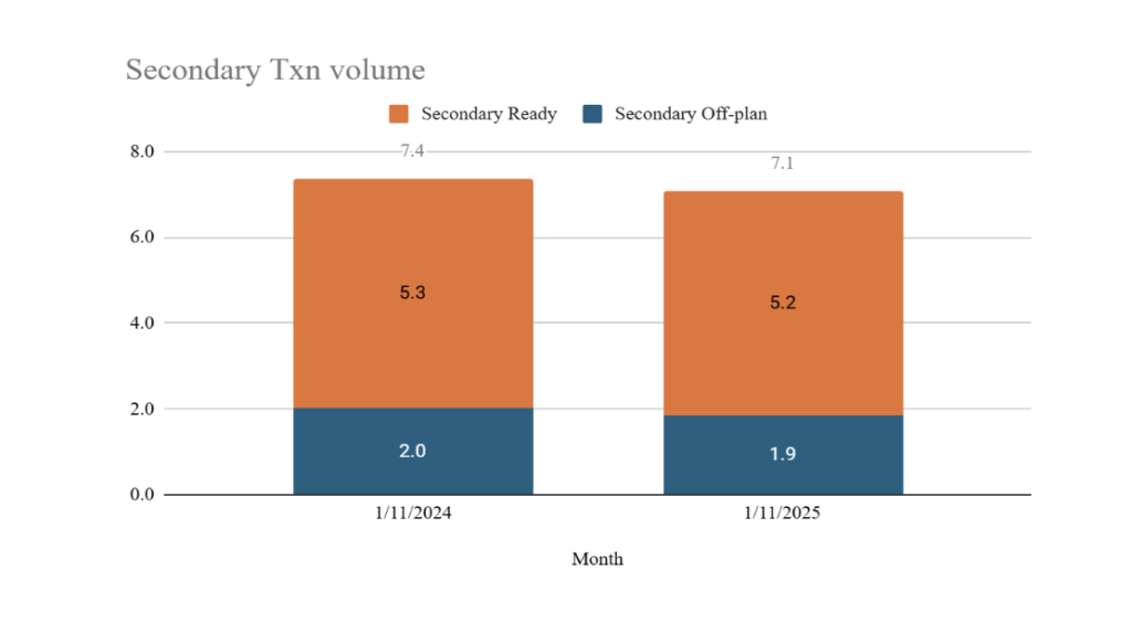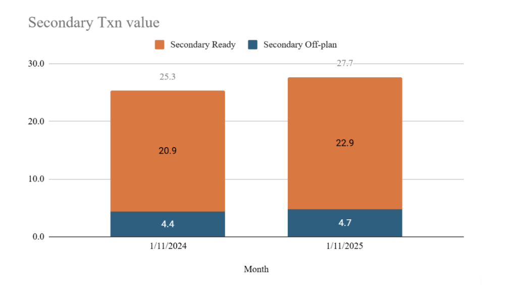 في المقابل، تراجعت أحجام المبيعات الثانوية بنسبة 4% على أساس سنوي، حيث انخفضت صفقات الوحدات قيد الإنشاء بنسبة 8%، وتراجعت صفقات الوحدات الجاهزة بنسبة 2% على أساس سنوي.