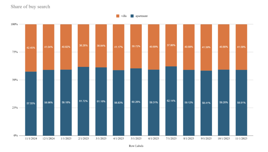 أما في سوق الشراء، فتمثل الشقق 58% من إجمالي عمليات البحث، بينما تراجعت حصة الفلل بشكل طفيف خلال العام. وتتركز نحو 70% من عمليات البحث عن الشقق في الوحدات المُزودة بغرفة أو غرفتَي نوم، ما يعكس استمرار التوجه نحو المنازل المتوسطة الحجم ذات الأسعار المناسبة في المجتمعات الحيوية والمتصلة جيدًا بالمدينة.