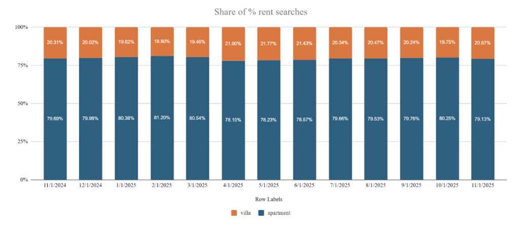 ووفقًا لبيانات “بروبرتي فايندر”، تستحوذ الشقق على نحو 80% من إجمالي عمليات البحث عن الإيجارات، مقارنةً بـ 20% فقط للفلل ومنازل التاون هاوس. كما شهدت الشقق الاستوديو والوحدات المكونة من غرفة نوم واحدة زيادة سنوية في حصتها من إجمالي الطلب على الإيجار.