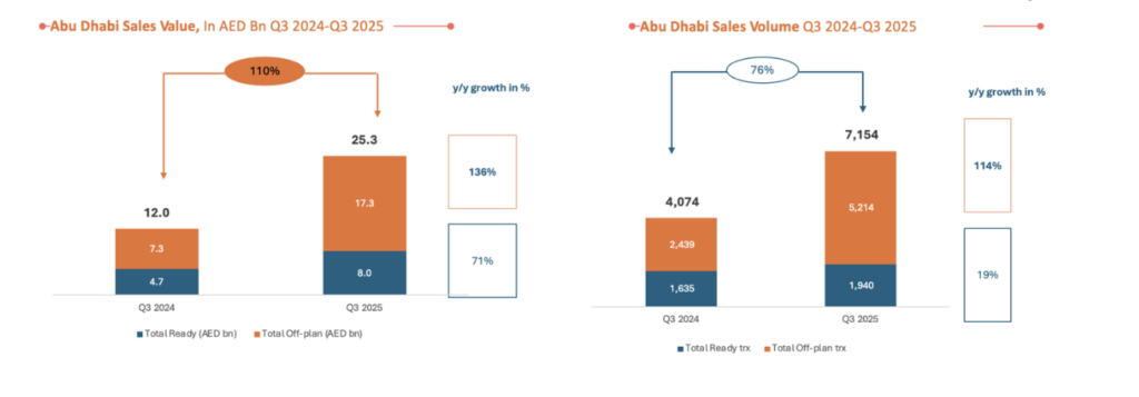 شهدت إمارة أبوظبي نمواً غير مسبوق، إذ ارتفع إجمالي عدد معاملات البيع إلى 7,154 معاملة، ما يمثل زيادة سنوية بنسبة 76%، فيما قفزت القيمة الإجمالية للمعاملات بنسبة 110% لتصل إلى 25.3 مليار درهم إماراتي.