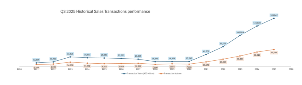 بلغ سوق العقارات في دبي ذروته التاريخية خلال الربع الثالث من عام 2025، مسجلاً أعلى حجم معاملات ربع سنوي على الإطلاق. إذ تم تنفيذ 59,044 معاملة بيع، بزيادة نسبتها 17% على أساس سنوي، بينما ارتفعت القيمة الإجمالية للمعاملات بنسبة 19% لتصل إلى 169 مليار درهم إماراتي.