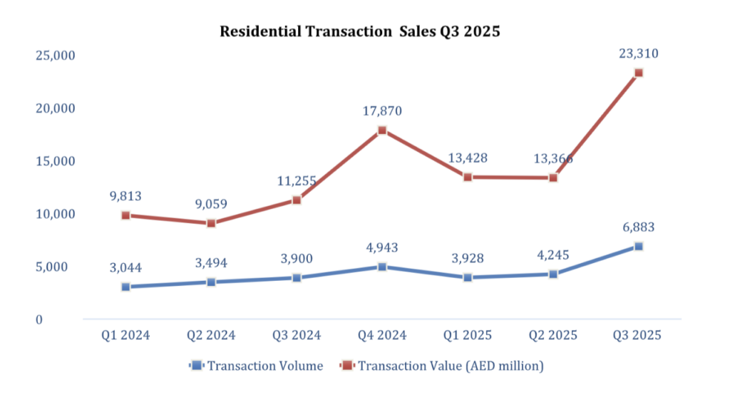 كما شهدت المبيعات السكنية الجاهزة نمواً بنسبة 15% من حيث الحجم و 56% من حيث القيمة لتصل إلى 6.1 مليار درهم إماراتي، مدفوعةً بطلب مزدوج من المشترين من الفئة المتوسطة إلى جانب المستثمرين في الفلل الفاخرة.