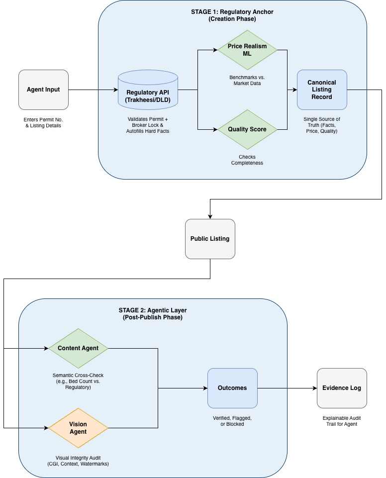 The foundation of a high-trust marketplace isn’t a document; it’s a Regulatory API. In our ecosystem, this means a deep, real-time integration with official government databases (like Trakheesi). By verifying “hard facts” at the point of creation, we shift from a catch-and-correct model to a prevention-first architecture.