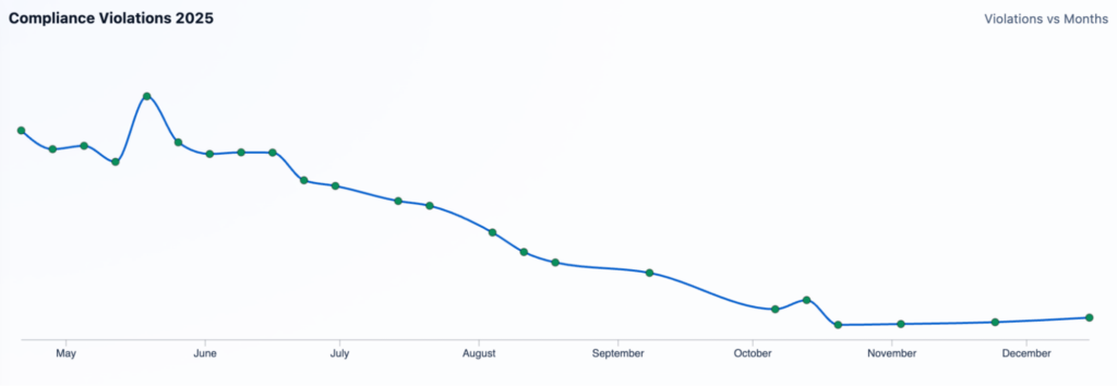 During the initial rollout of real-time API validation, attempted violations peaked in May. As agents adapted to the hard-truth constraints of Stage 1 and recognised that bait pricing and permit mismatches could no longer be published, attempted non-compliance steadily declined. By December, violations had dropped by over 90%.
