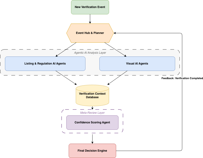 Between these analysis steps and final enforcement lies the context. This central repository aggregates signals to provide the review layer with a ‘holistic context’. Each verification produces evidence, not verdicts. Outputs are synthesised through a review layer designed to balance precision and recall, with explicit safeguards against false positives and negatives in a high-stakes marketplace.